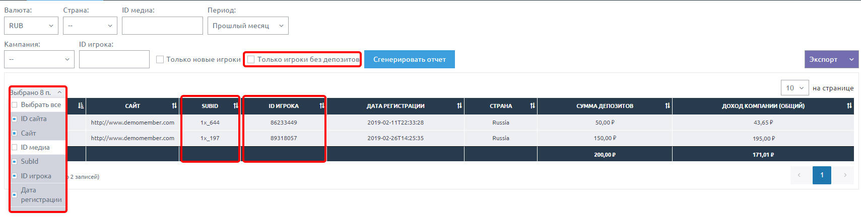 Есть возможность увидеть даже ID игрока, который является его номером игрового счёта. Новые счета появляются в отчёте с момента внесения игроком депозита на счёт, но нажав галочку "Только игроки без депозитов" вы можете сделать выгрузку по аккаунтам, которые еще не внесли депозит, а только зарегистрировались.