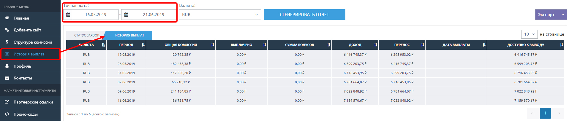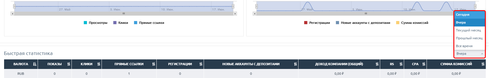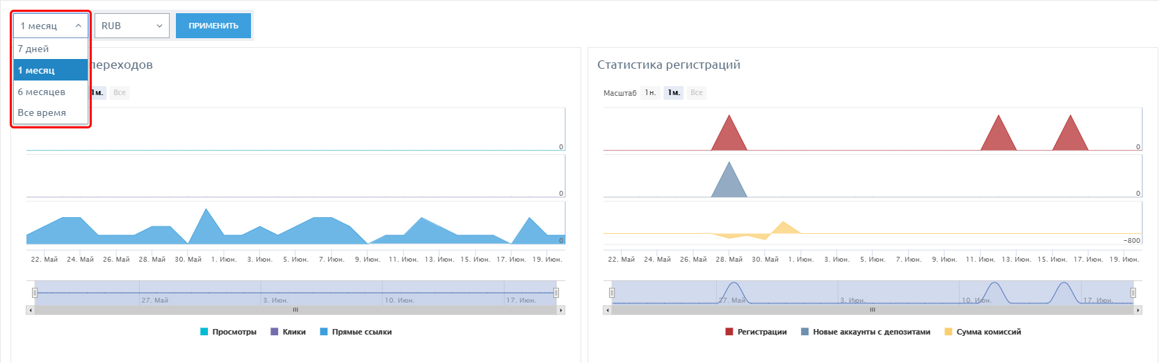 ВАЖНО! В отличие от статистики на Главной странице, в любом из этих отчётов выбрав Текущий месяц Вам будут выведены данные с учётом текущего дня по всем показателям, кроме вашей комиссии, потому что расчёт по ней происходит на следующий день. Если решите подсчитать вручную заработанную комиссию, советуем выбирать дату без учёта текущего дня.