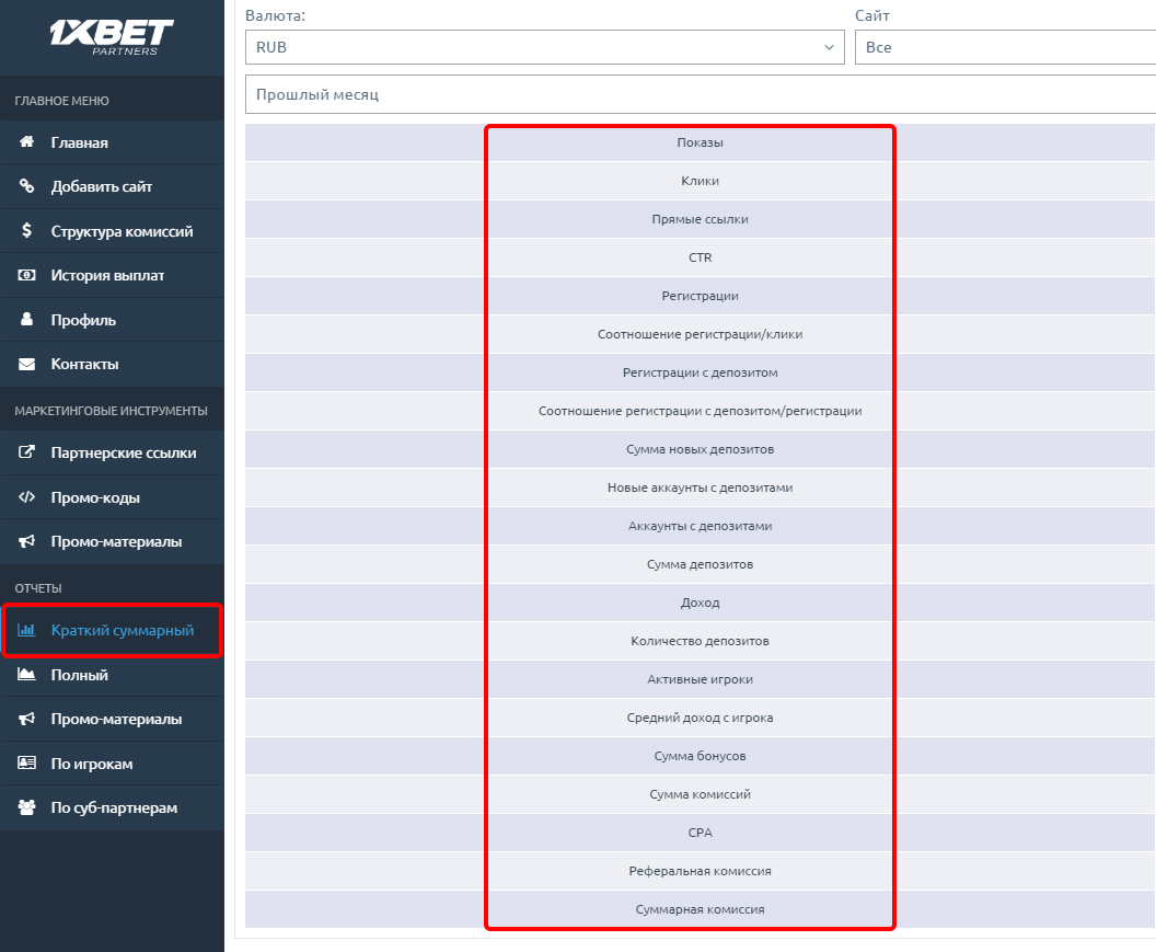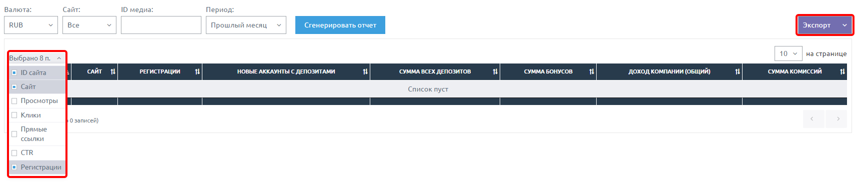 Полный отчёт – даёт более детальные данные по статистике партнерского аккаунта за выбранный период. Разбивка идёт по сайтам и помимо параметров, что есть в Кратком отчёте, добавляются еще данные о сайте и его ID, возможность выгрузить отчёт в Excel или CSV, включать и выключать разделы отчёта.