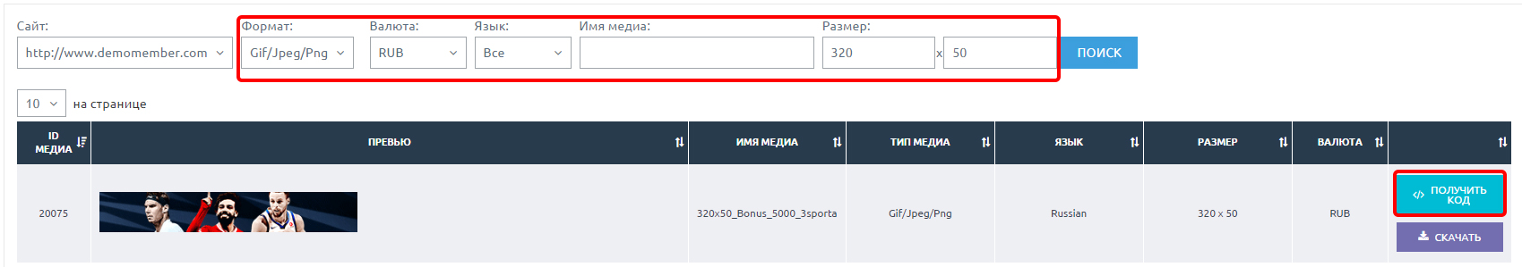 Для их получения, выберите, в разделе Маркетинговые инструменты пункт Промоматериалы, далее из списка выберите нужный Вам баннер и нажмите кнопку "Код". Этот код необходимо скопировать и разместить на своем сайте.