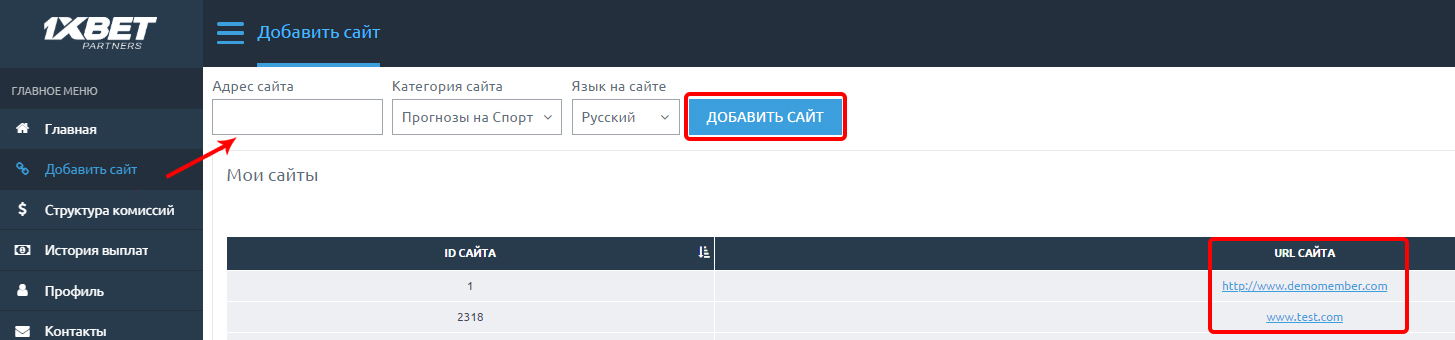 Предоставление актуального источника трафика является обязательным условием сотрудничества, поэтому для указания своих ресурсов необходимо перейти в раздел Добавить сайт, заполнить требуемые поля и нажать "Добавить". Сайт появится в списке, а также в специальном поле после генерации. Это нужно для того, чтобы мы видели с каких источников трафика идут игроки и не используются ли запрещенные виды трафика для продвижения бренда 1xBet. Также это позволяет создавать разные ссылки и затем отслеживать эффективность трафика.