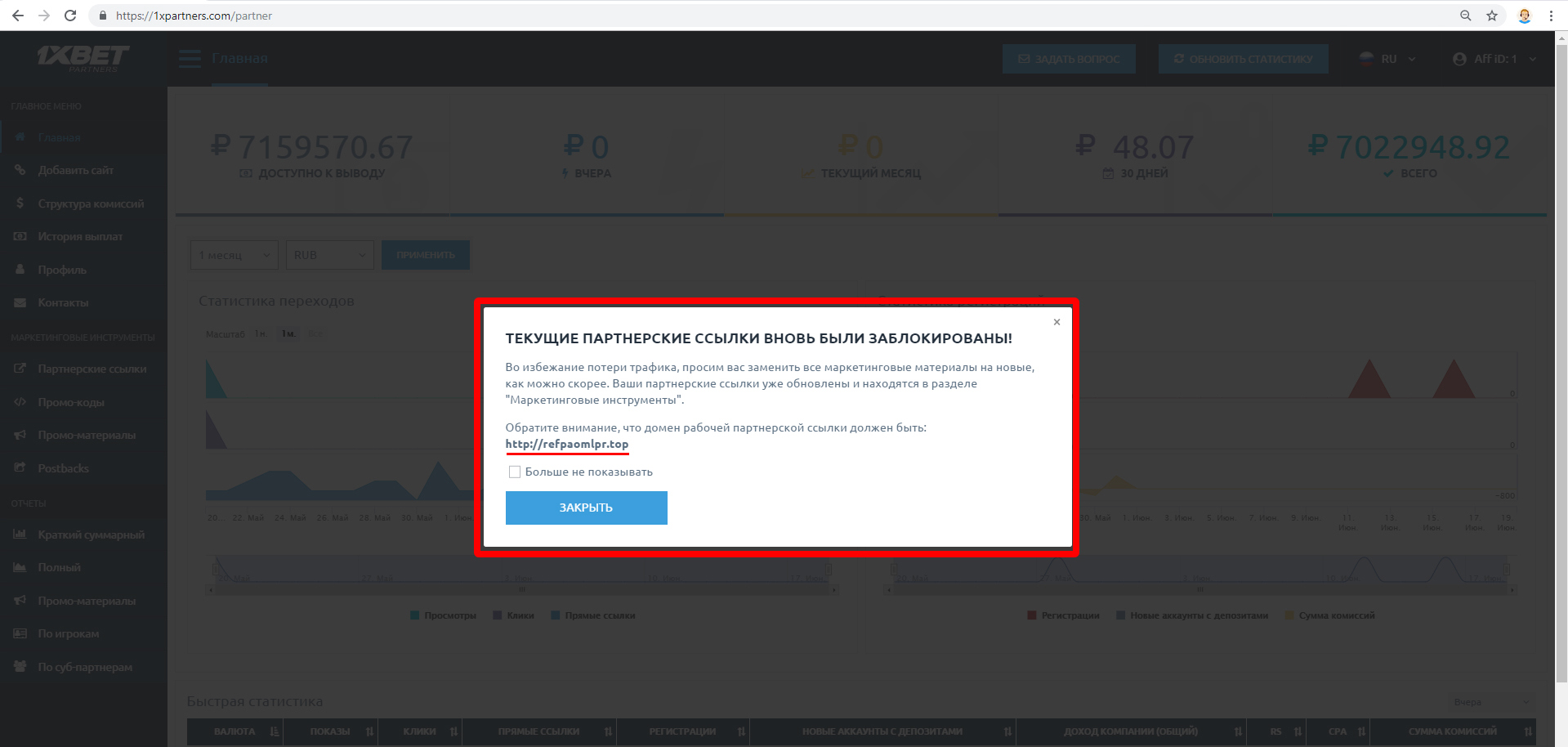 Вы можете выбрать "Больше не показывать" его, так как при каждой блокировке актуальный домен будет приходить вам на email и в наш Telegram-канал. Вам необходимо следить за обновлением доменов (они обновляются как правило каждый день), потому что их блокирует Роскомнадзор на территории РФ, а старые домены время от времени прекращают свою работу. Поэтому для бесперебойного доступа ваших пользователей к сайту следует менять домен в Ваших ссылках самостоятельно или же заходить в личный кабинет и копировать новую ссылку целиком. Создавать каждый раз новую ссылку не нужно, она обновится автоматически.