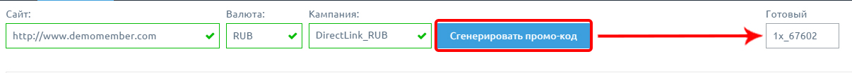 Чтобы получить промокод, выберите, в разделе Маркетинговые инструменты" пункт Промокоды и нажмите "Сгенерировать". Он будет выглядеть следующим образом 1х_1111.