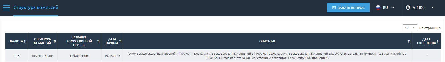 Здесь Вам видна Ваша комиссионная структура: Revenue Share, ее начало, описание и дата окончания.