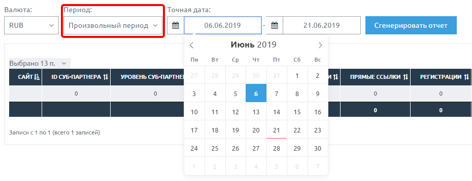 Отчёт по суб-партнёрам – даёт возможность увидеть статистику привлеченных суб-партнёров. Подключение данного вида сотрудничества обсуждается индивидуально с менеджером.
