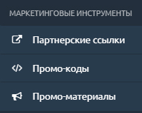 Дальше в меню располагается раздел Маркетинговые инструменты, без которого Вы не сможете начать свою работу, а мы отслеживать её результат.